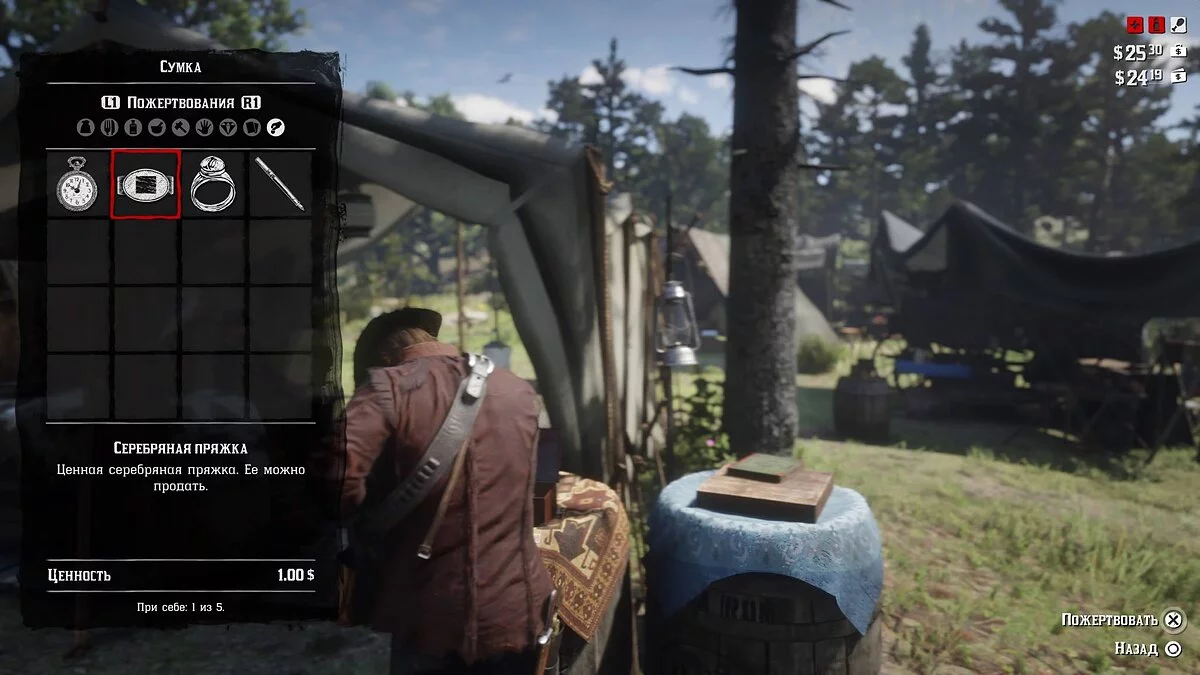 The gang leader, Dutch, is located in a tent in the center of the camp. Near him, you can find two important barrels — one has a box on it where you can donate unnecessary junk, valuables, and money, and next to it — Strauss's ledger. Through it, gameplay upgrades are made, such as fast travel, but more on that below.