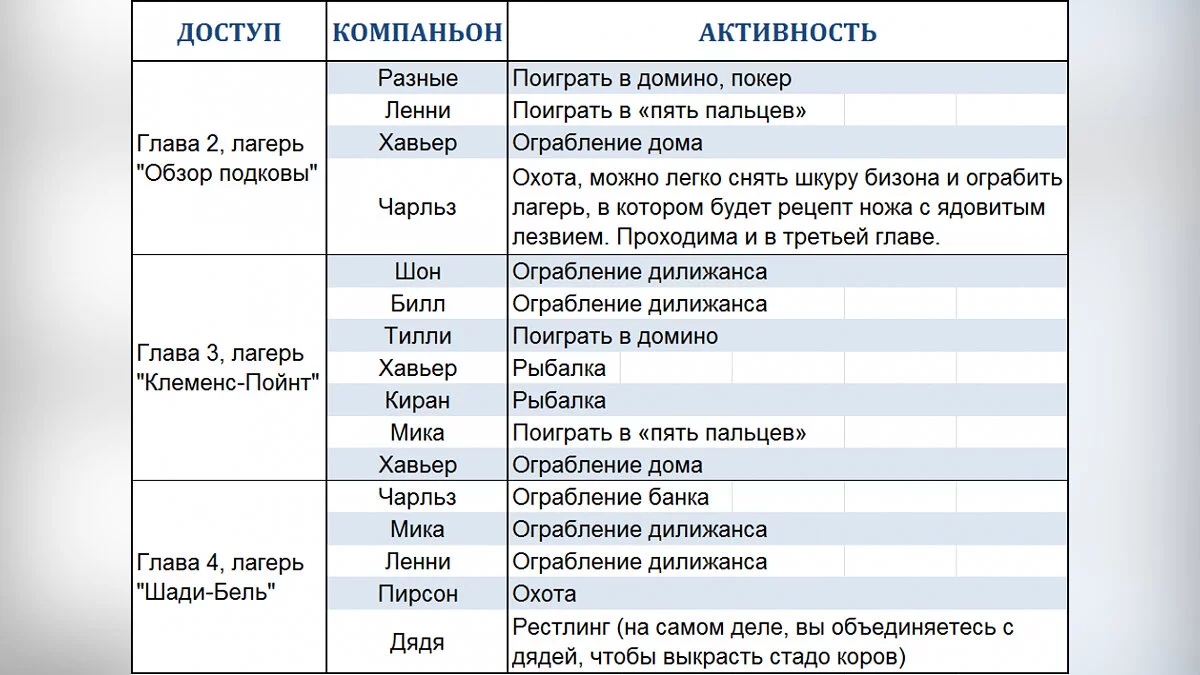 When you want to have fun, pay attention to the modestly standing table in the corner of the camp. There you can play cards or dominoes with other gang members, while listening to their stories. By talking, you can improve relationships, and even receive a personal quest.
