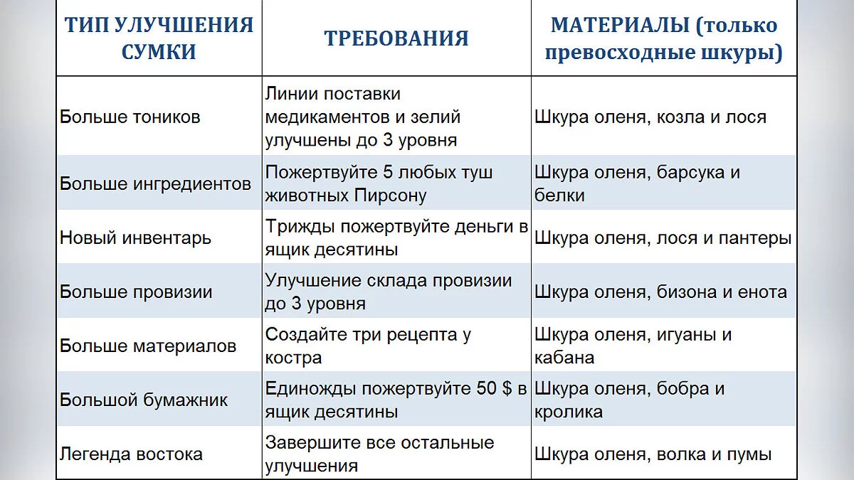 Pearson can also customize the main character's satchel appearance, increase its capacity for ammunition and medkits, and the number of items carried. In the following table, we've compiled all the necessary information: