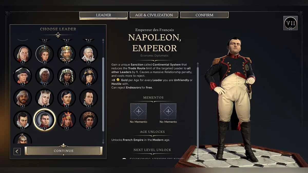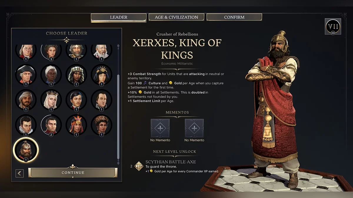 One more new addition that caught our eye while choosing a ruler: "Mementos" These are artifacts you can unlock during the game. However, you need to log into your 2K account for them to appear. This adds a meta element to the game, a progression not just within a single playthrough but across your total experience. Some of the bonuses are pretty impressive, but we’ve played without them for now.