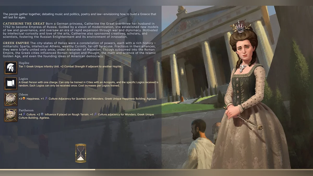 We too made a “strategic” choice and chose Greece. The developers mention it makes sense, as Catherine was inspired by Greek ideas. However, we were more drawn to the cultural bonuses. And so, the game begins.