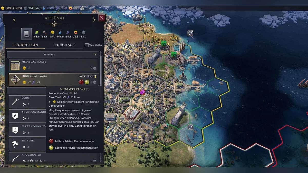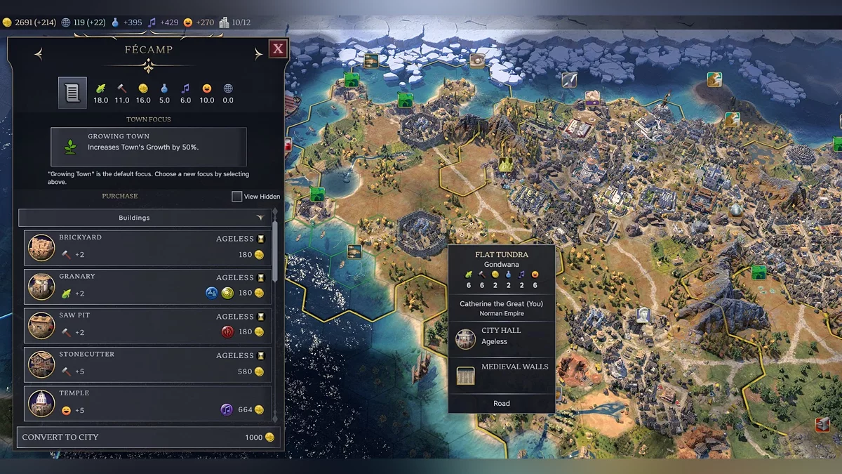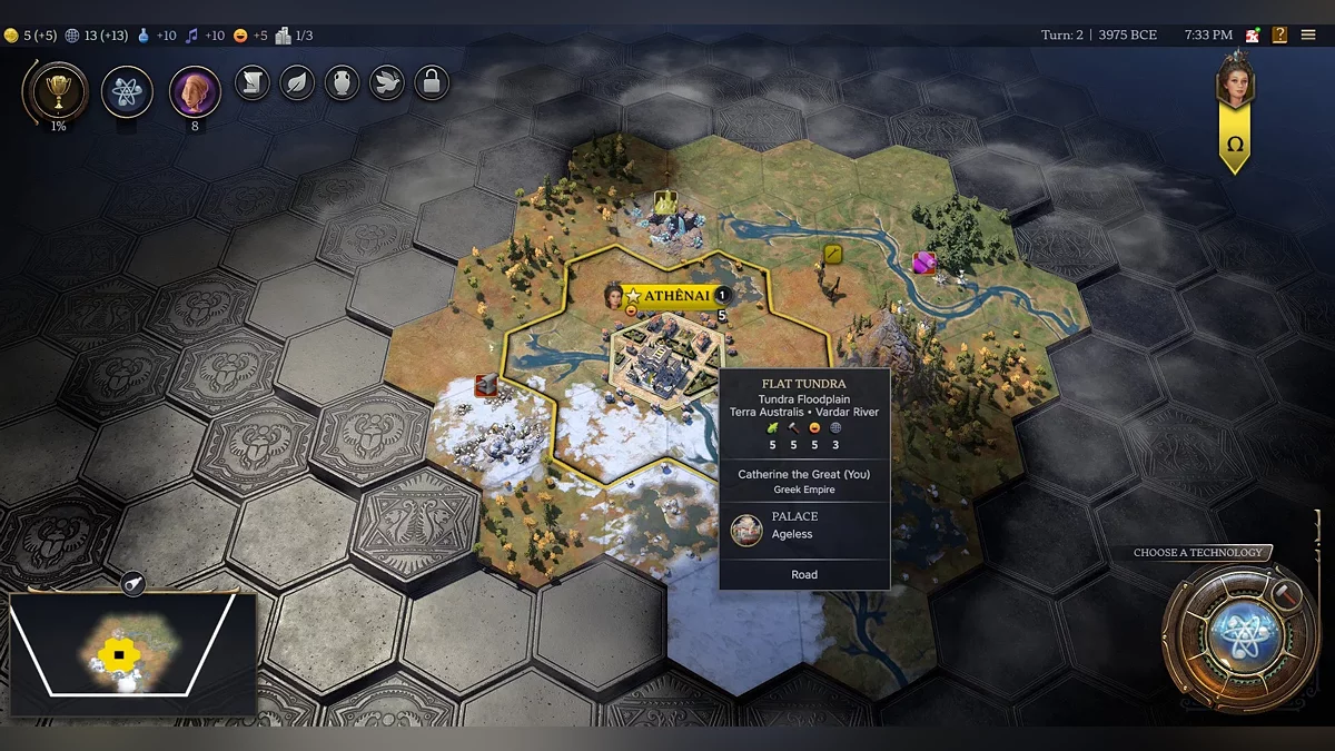 In the cold tundra—where Catherine II’s journey begins thanks to geographical bonuses—Athens appeared. We start to get acquainted with how the city-building mechanics work in the seventh “Civilization.” And once again, we realize everything is different. Workers no longer exist, and instead, each time a new citizen appears, you need to choose which tile to improve.