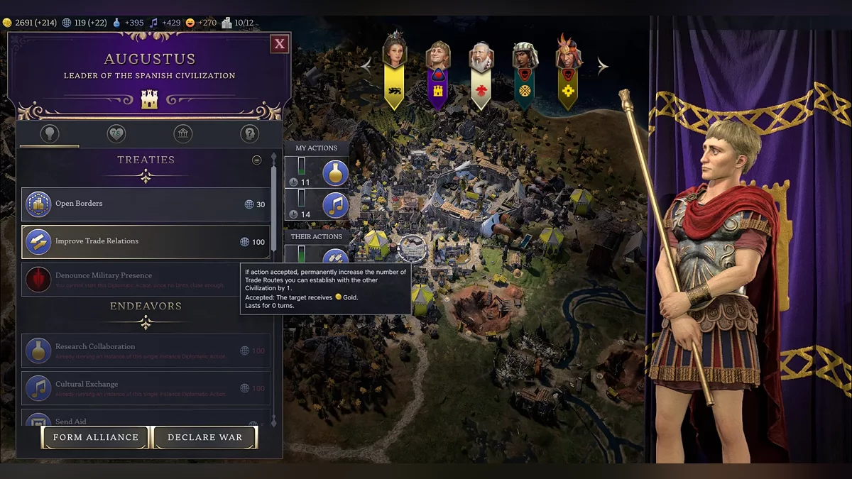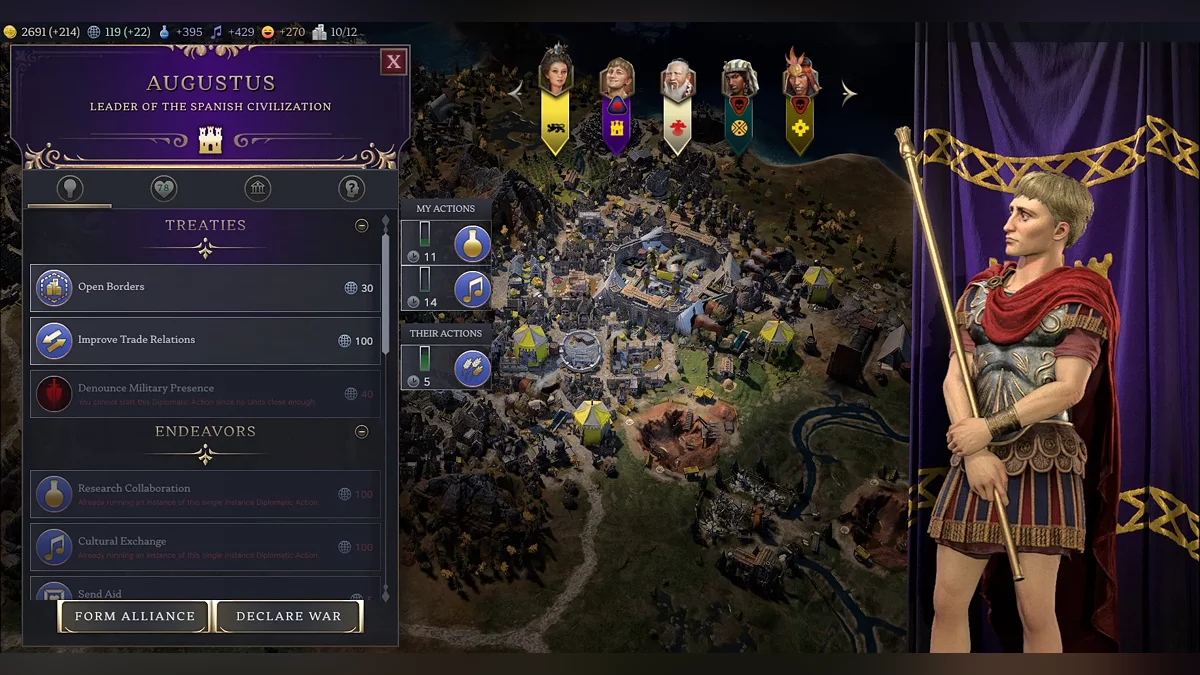 In diplomacy, you can not only form alliances but also sign various narrower agreements that provide bonuses to both civilizations. You can boost almost all characteristics this way, so being friends with neighbors feels more advantageous than ever. But all of this will cost influence.