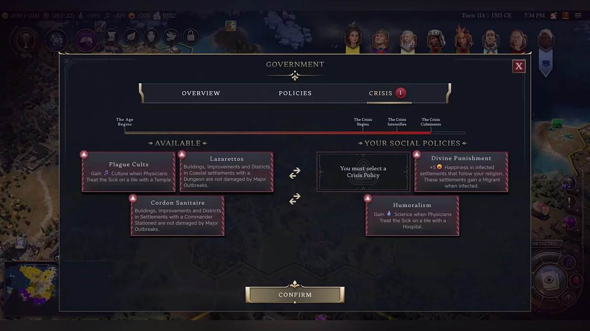 The path to victory in the new Civilization is through, as mentioned, three eras. That means the game has gotten shorter, but also more challenging. There’s an era progress system that advances as states unlock new technologies and social institutions. Near the end of each era, you encounter a new mechanic that Firaxis seems to have borrowed from Paradox Entertainment — crises.
