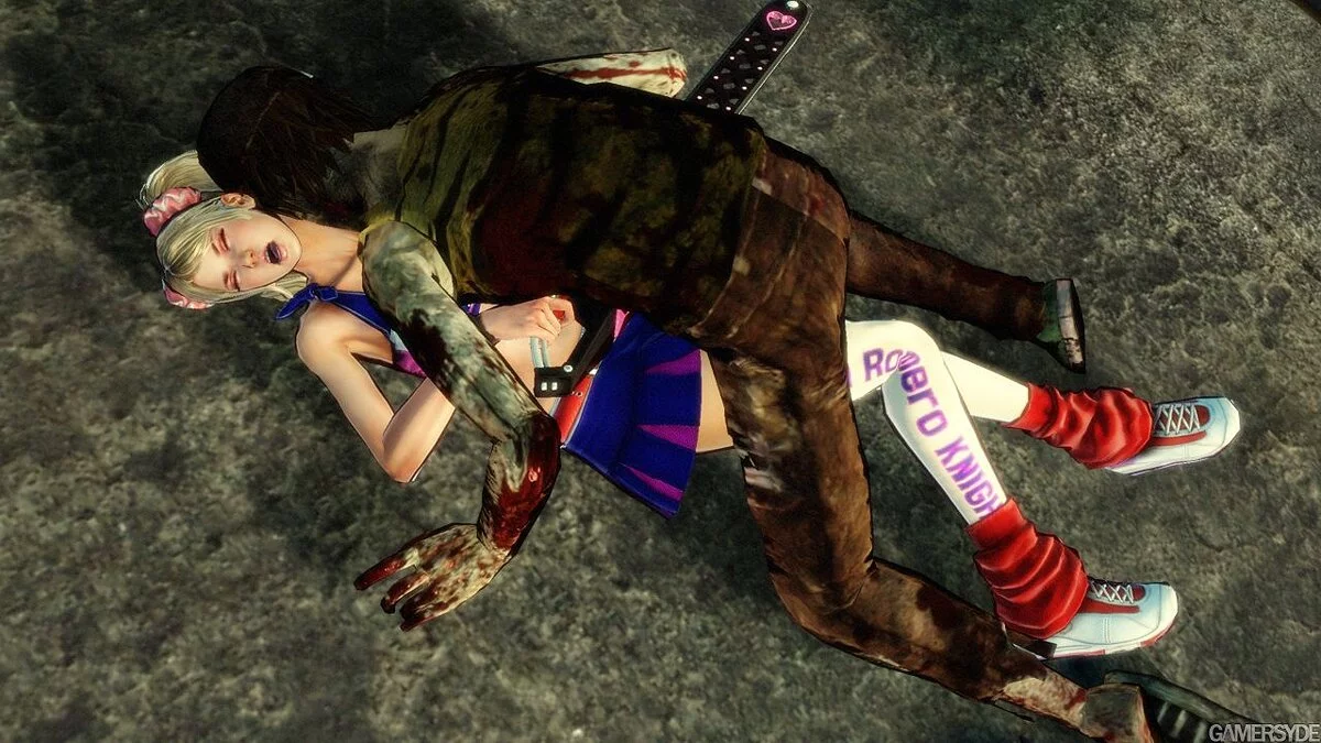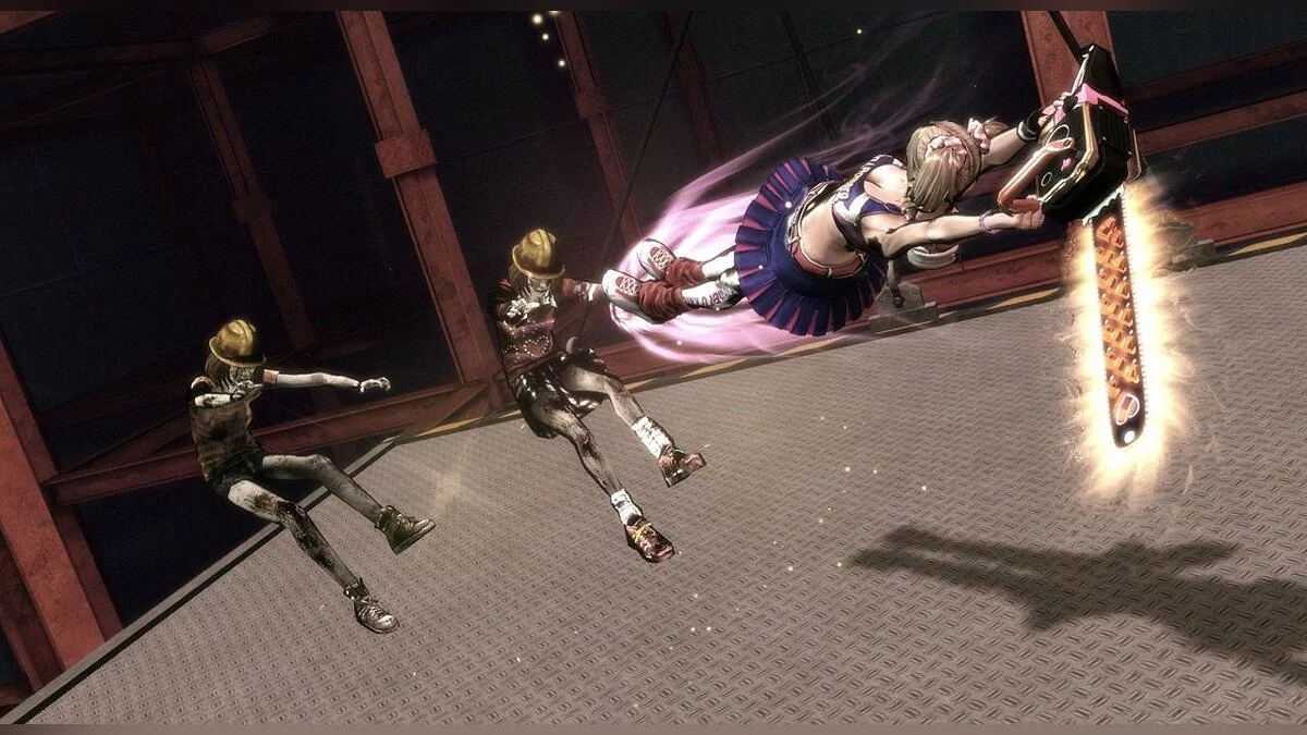 Muito bem então. Lutamos contra hordas de mortos-vivos e finalmente encontramos o namorado da nossa heroína, mas há outro problema—ele está infectado com o vírus. Para evitar que ele se transforme em um zumbi, Juliet pega sua motosserra e corta a cabeça do namorado. Surpreendentemente para os jogadores, a cabeça continua viva, até fala, e será nossa companheira durante todo o jogo. Posso estar errado, mas acho que isso é um pouco exagerado. Quanto às batalhas com zumbis, não só a motosserra é usada, mas também pompons, e Juliet usa suas habilidades acrobáticas durante as lutas. É durante essas acrobacias que Juliet se mostra em toda a sua glória. Bem, se você sabe o que quero dizer. Claro, haverá gamers que vão querer espiar sob a saia curta da nossa heroína, mas há dois obstáculos: controles de câmera inconvenientes e o braço esguio de Juliet cobrindo suas costas. No entanto, como mencionado antes, durante as acrobacias de Juliet, pode-se vislumbrar o que ela esconde tão cuidadosamente.