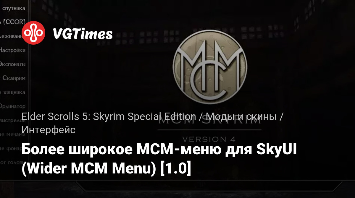 Wider MCM Menu расширяет MCM-меню, которое становится доступно после установки SkyUI. Нужно это для модификаций, в которых слишком длинные названия параметров, изменяемых в MCM.