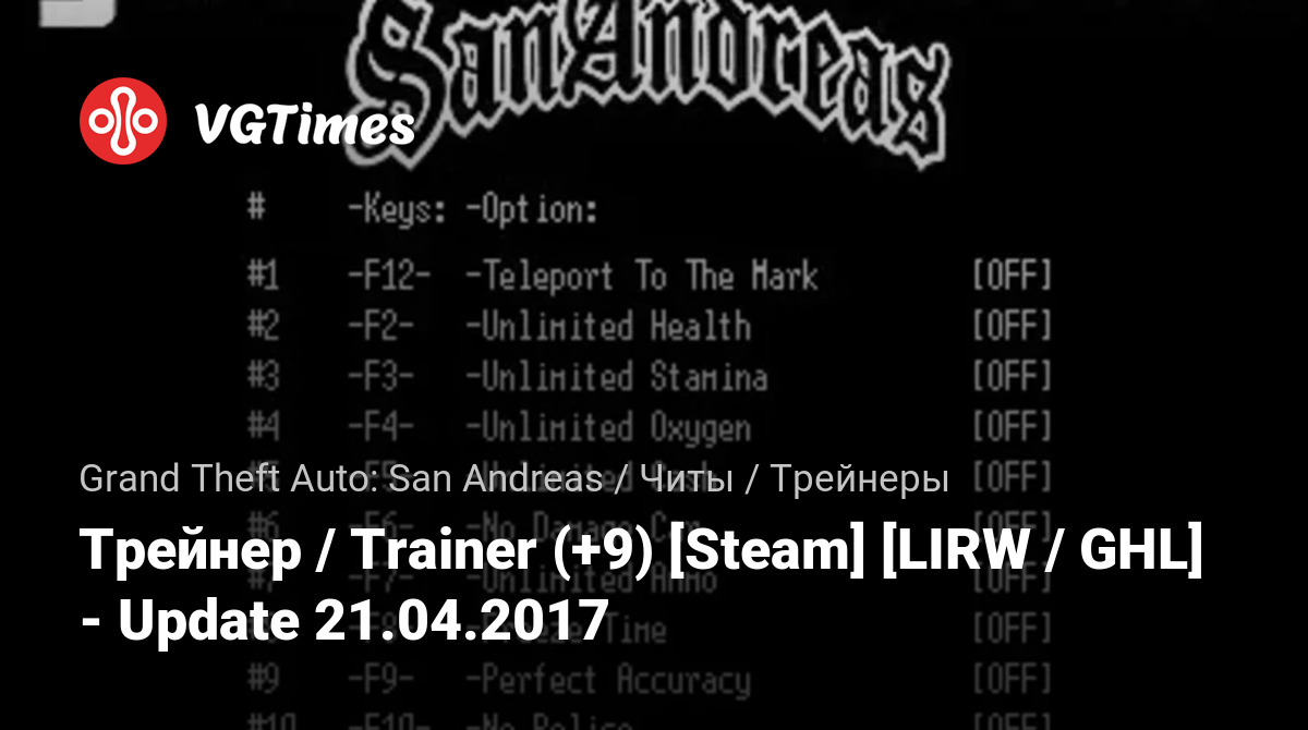 Jogos Grand Theft Auto: San Andreas Arquivos Treinadores Трейнер / Trainer (+9) [Steam] [LIRW / GHL] - Update 21.04.2017