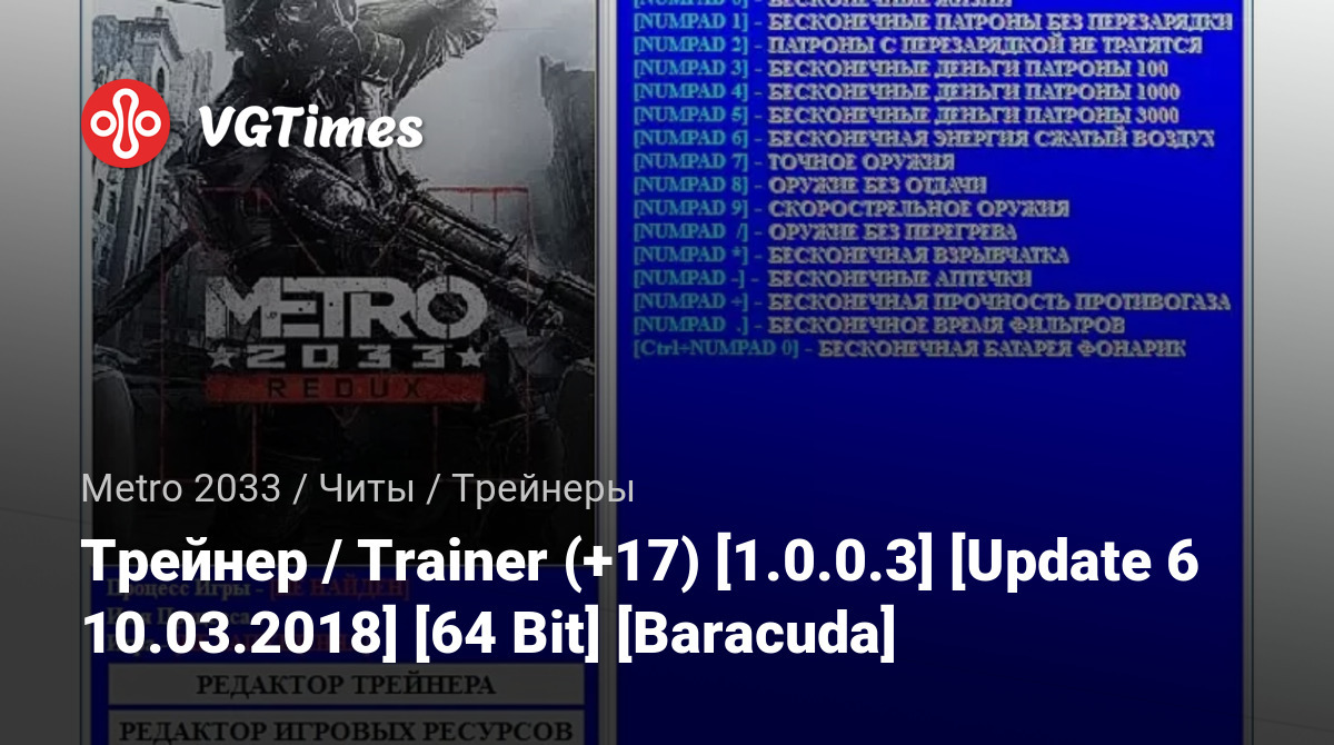 Jogos Metro 2033 Arquivos Treinadores Трейнер / Trainer (+17) [1.0.0.3] [Update 6 10.03.2018] [64 Bit] [Baracuda]