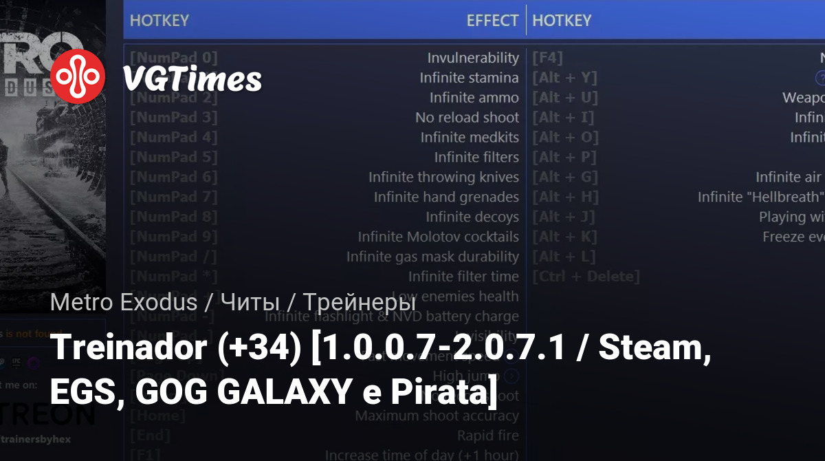 Jogos Metro Exodus Arquivos Treinadores Treinador (+34) [1.0.0.7-2.0.7.1 / Steam, EGS, GOG GALAXY e Pirata]