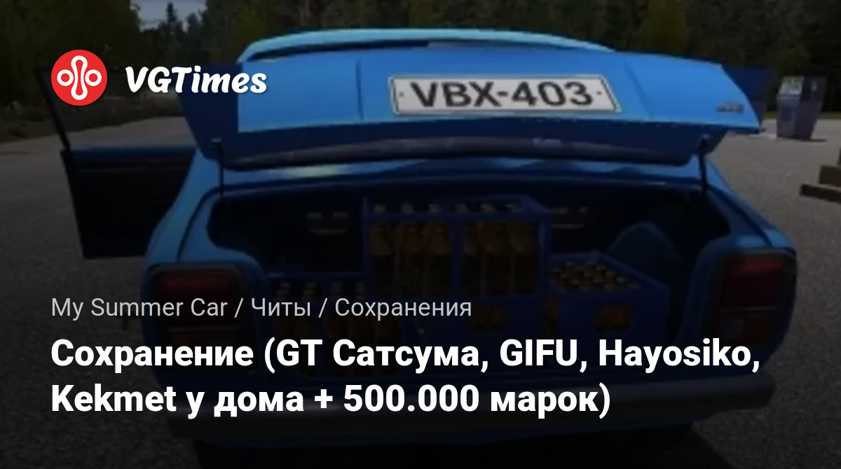 Полный тюнинг GT Сатсумы (Стоит в гараже). Грузовик, фургон, трактор стоят у дома. Мопед в гараже. В кармане у персонажа 500 тысяч марок.