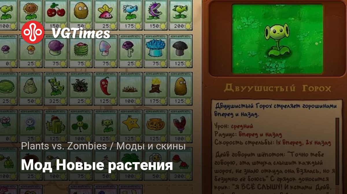 Авторский мод который заменяет многие растения на новые, меняется их внешний вид и описание, механика игры не изменена, поэтому все способности растений остаются прежними.