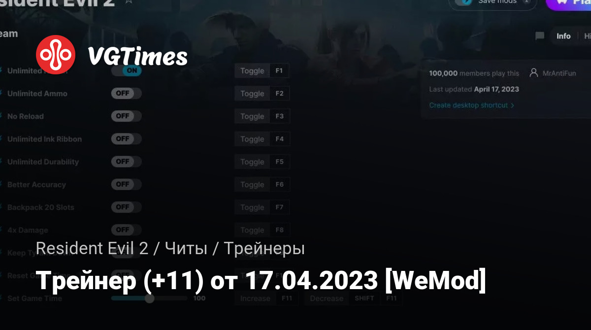 • Resident Evil 2 — Трейнер (+11) от 17.04.2023 [WeMod]
