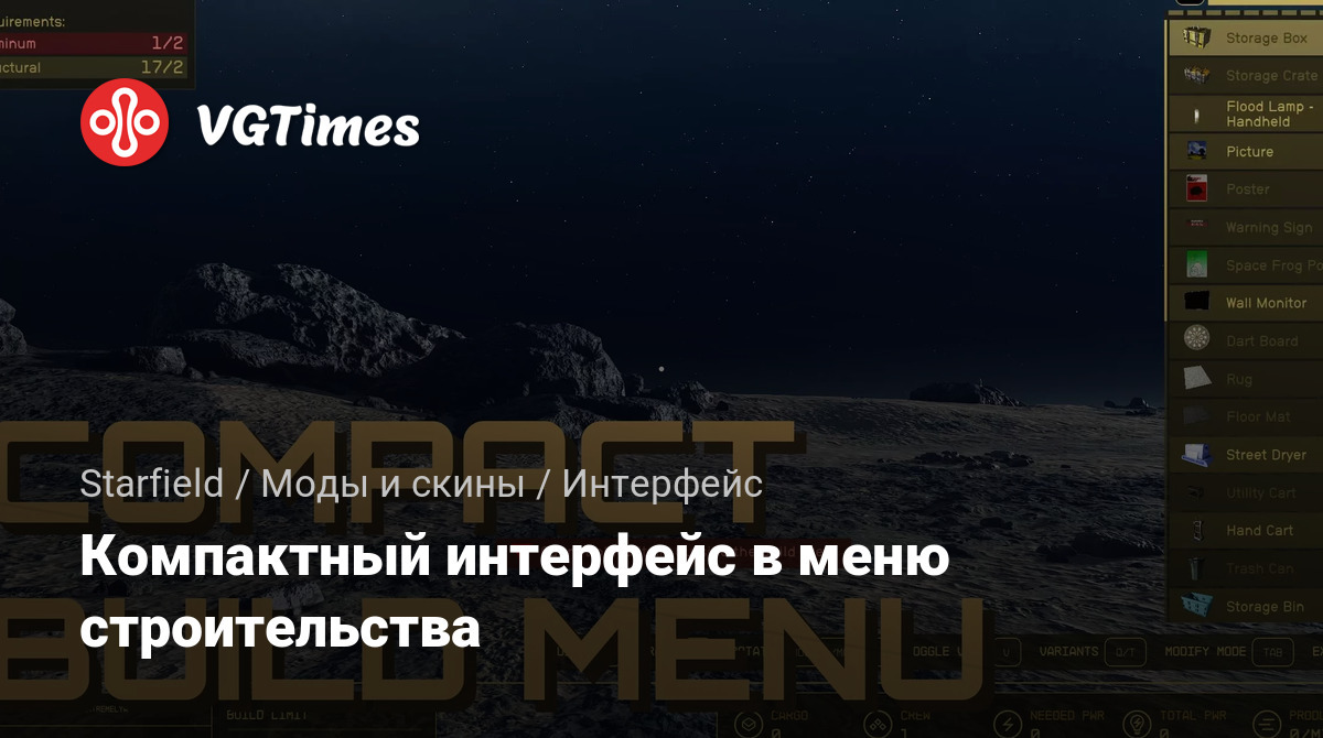 Модификация улучшает пользовательский интерфейс в меню строительства аванпостов. Файл изменяет элементы таким образом, чтобы можно было одновременно видеть больше предметов. Увеличивает количество видимых предметов на 45%.