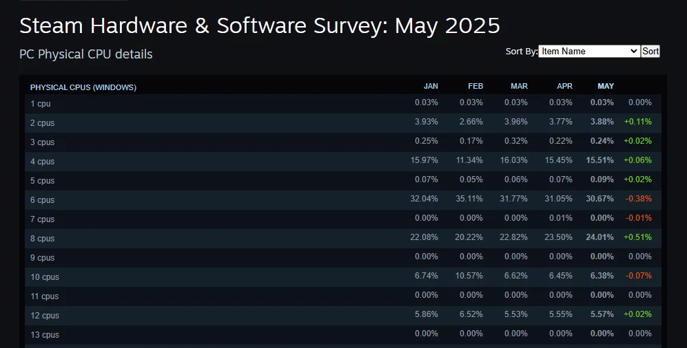 De acordo com os requisitos, é necessário um CPU de oito núcleos mesmo para as configurações gráficas mínimas. Enquanto isso, dados recentes da Pesquisa de Hardware do Steam mostram que 50,42% dos usuários ainda estão usando processadores com seis núcleos ou menos, como o AMD Ryzen 5 9600X.