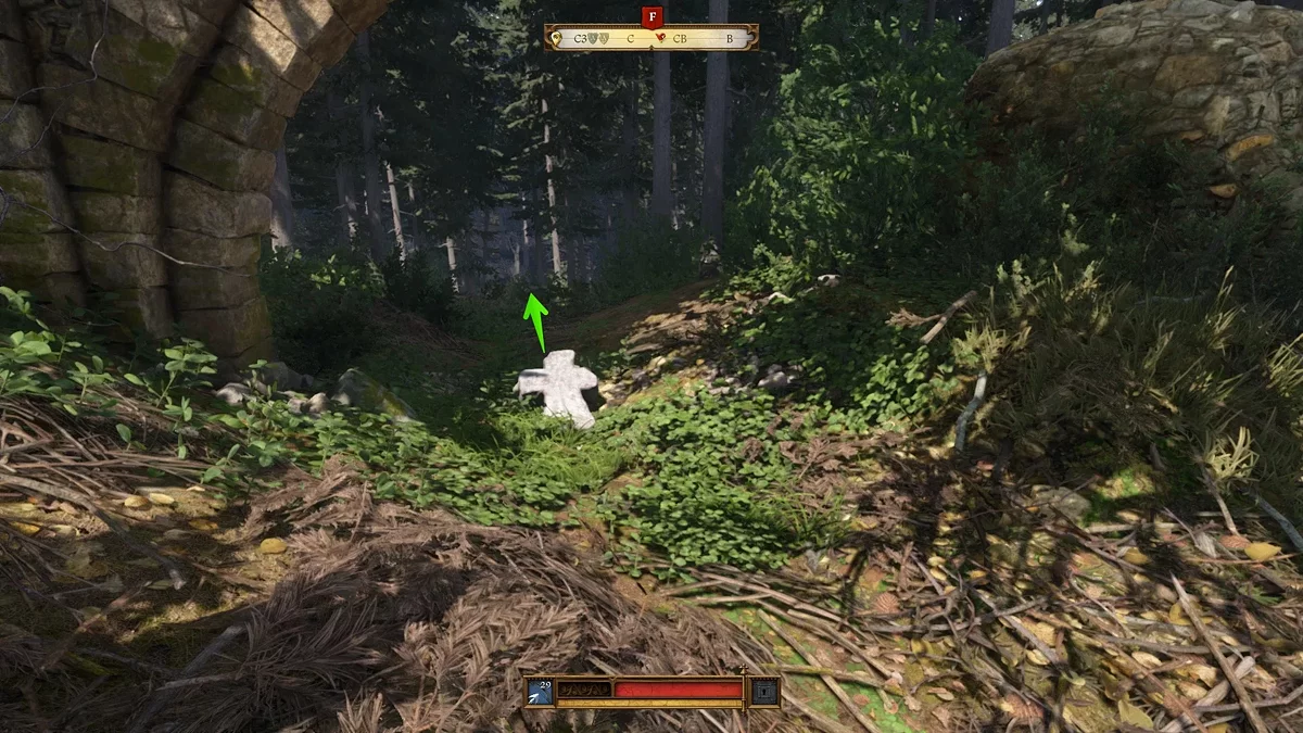 Perto das ruínas, encontre uma ponte quebrada. Debaixo dela está a primeira cruz — siga na direção que seu topo está apontando.