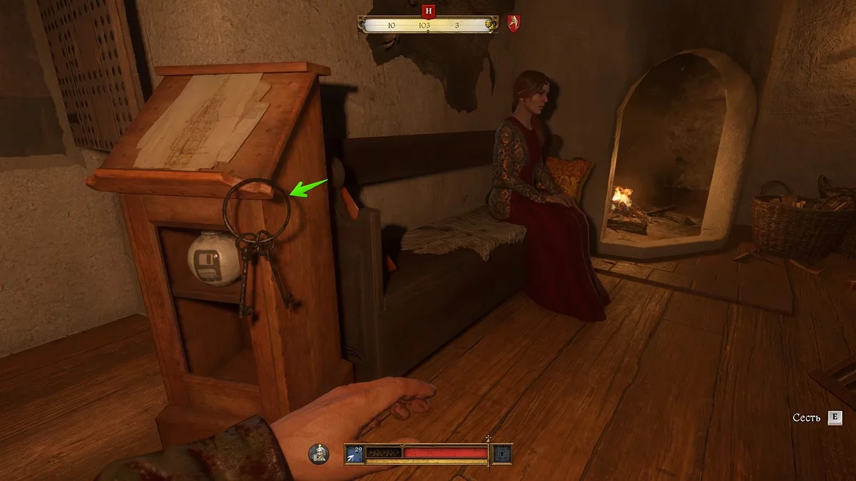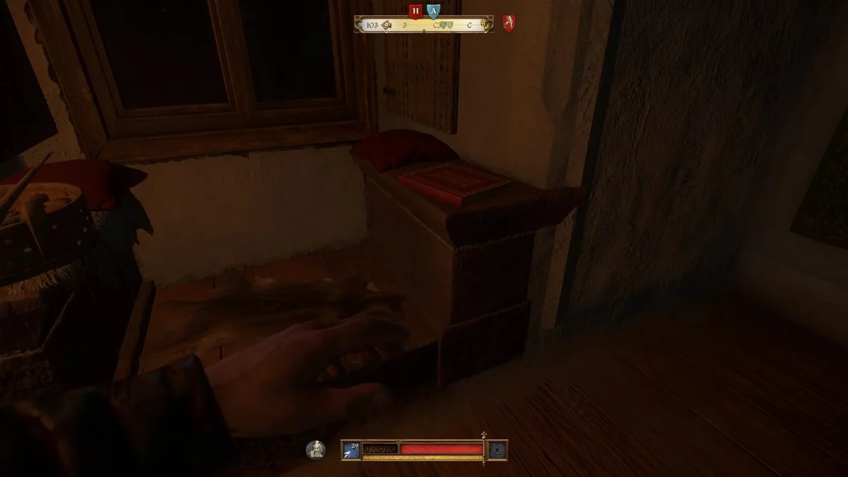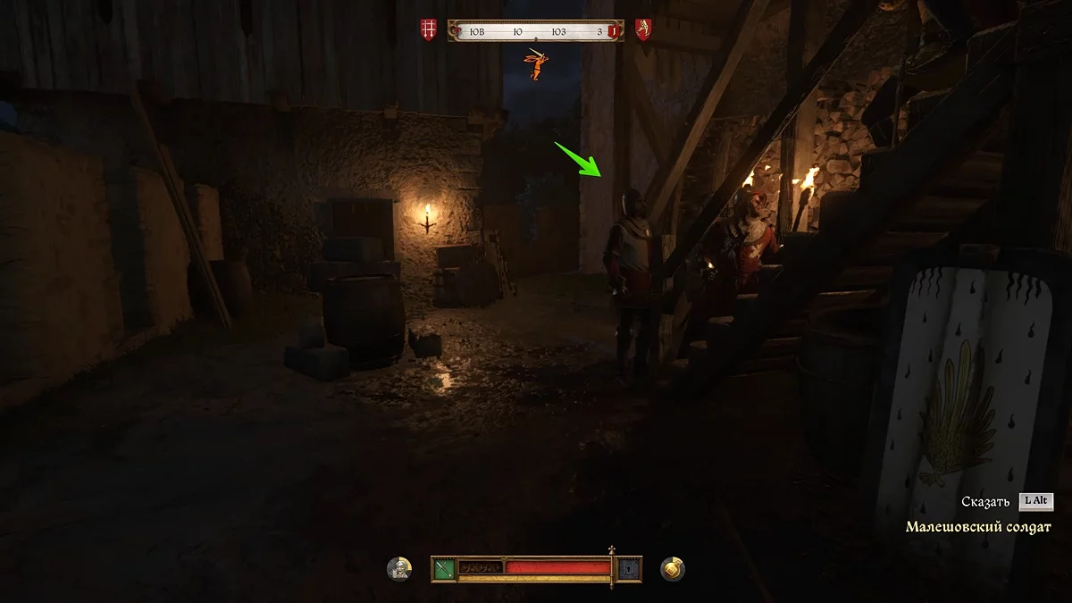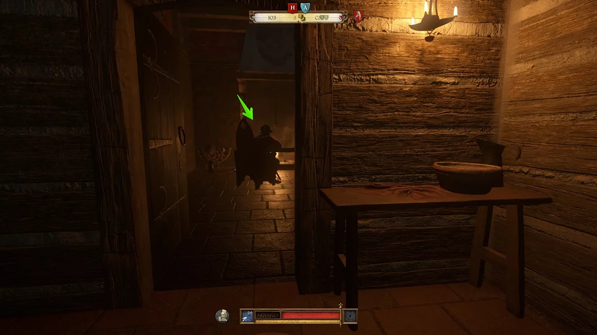 A melhor maneira é se esconder na cozinha, e quando um dos soldados for pegar comida, elimine-o e imediatamente carregue o corpo para o armário sob as escadas. Se você deixar o corpo aqui, o segundo soldado, que quer tirar vinho do barril, aparecerá em breve. A propósito, você pode envenenar o vinho para que o segundo soldado adormeça ou morra (dependendo das poções disponíveis de Henry). Mesmo que não haja poções, basta esperar até que ele retorne à sala e se sente na cadeira — elimine-o por trás.