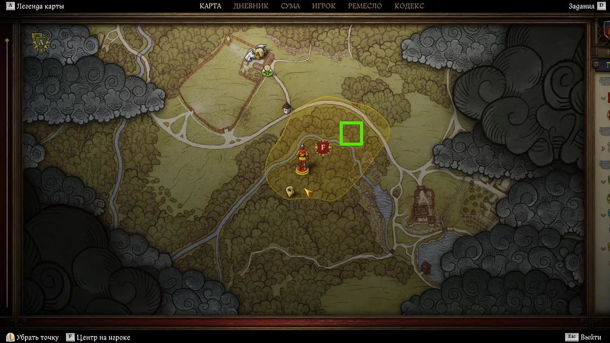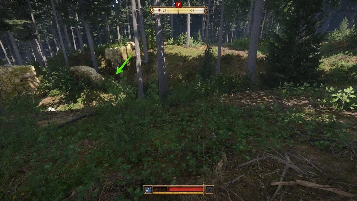 Uma área marcada aparecerá no mapa um pouco abaixo dos estábulos. Siga a estrada até aqui e encontre a capela — a localização mudará. Do lado esquerdo da estrada, você deve ver uma rocha, atrás da qual há ruínas, então desça e encontre um prédio destruído.