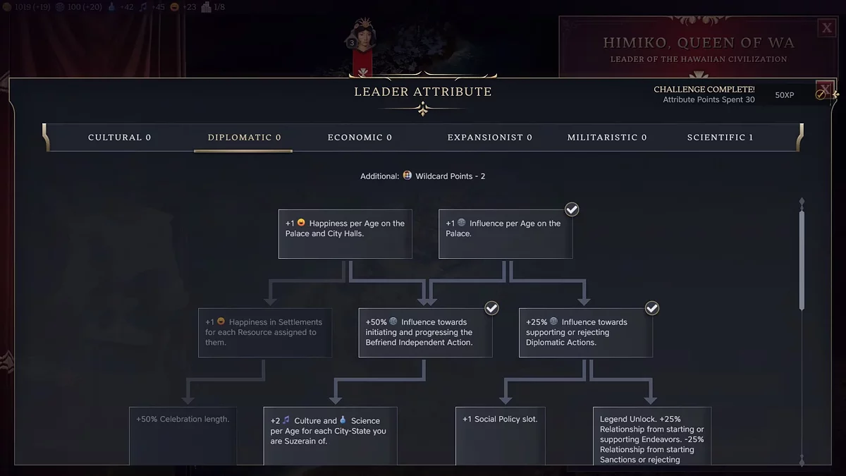 Certos personagens e estados podem ser mencionados separadamente. Alguns são particularmente focados em diplomacia e na agricultura de alta influência: Machiavelli e o japonês Himiko. Por exemplo, o líder da Terra do Sol Nascente não gasta pontos de influência ao aceitar uma oferta diplomática de cooperação. E Civilização Han tem muitos edifícios e bônus únicos que contribuem para o desenvolvimento da influência.