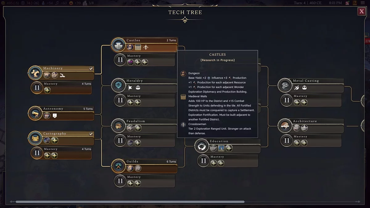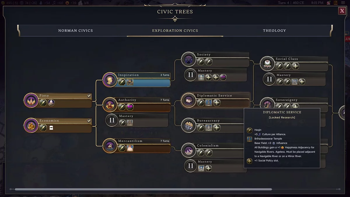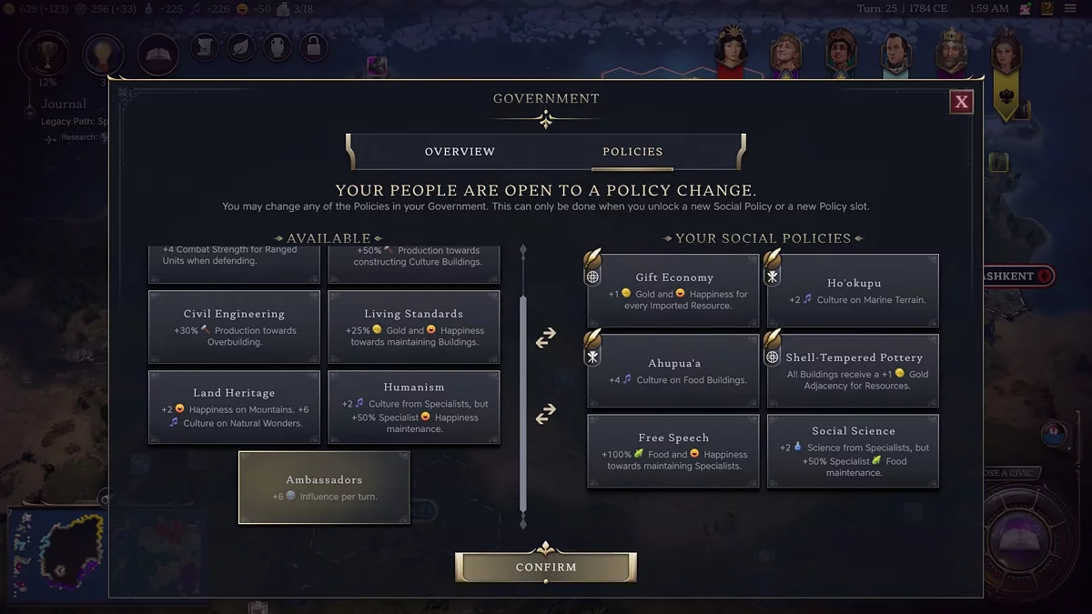 Um fator importante serão os decretos políticos no país. Muitos deles adicionam ainda mais influência ao tesouro do estado. Por padrão, cada jogador começa com a política do Direito Divino, que dá +1 de influência e cultura na capital.