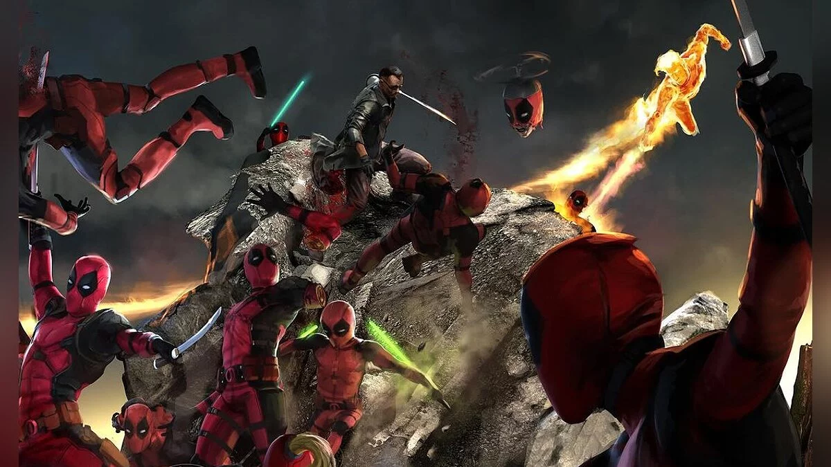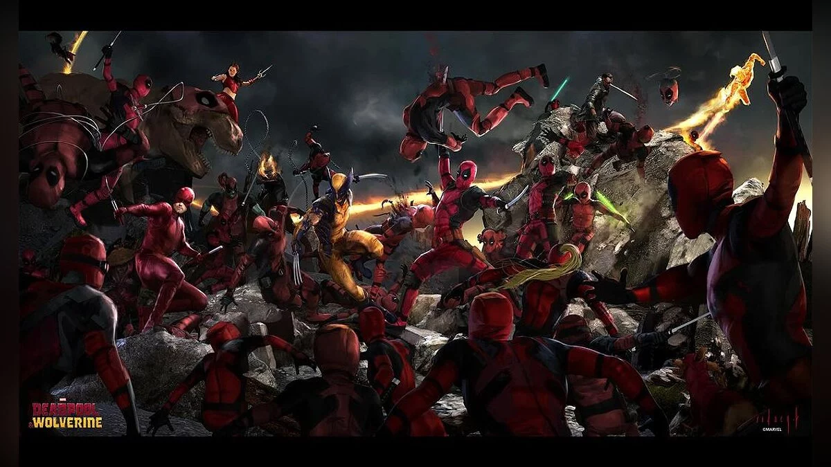 The illustration presents a large-scale battle involving the main characters and the Deadpool Corps. In the early version of the scene, you can see several new faces (and snouts): Deadpool Dinosaur, Ghost Rider, and Daredevil. The art also features Blade, Johnny Storm, and Elektra, who are in the movie but did not participate in this particular battle.