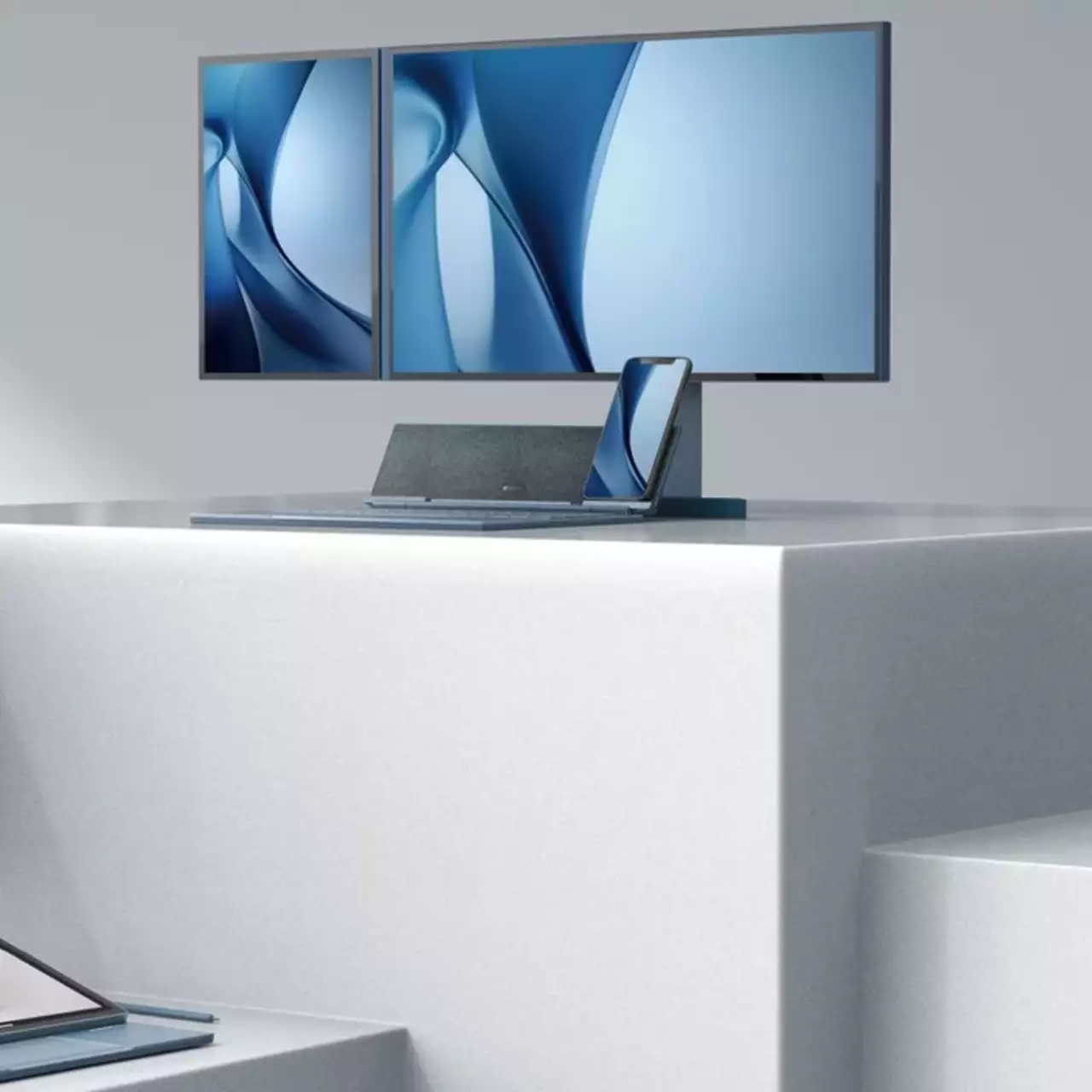 Para uso estacionário, o sistema inclui um monitor projetado de forma única: atrás da tela principal há um painel dobrável que abriga um sistema de resfriamento ativo e portas. Ao conectar o tablet ao lado esquerdo, os usuários criam uma configuração AIO de tela dupla onde o display secundário funciona como um módulo de computação. A parte de trás do suporte apresenta portas (HDMI, USB-C, Ethernet), transformando o monitor em uma estação de acoplamento totalmente funcional para periféricos.