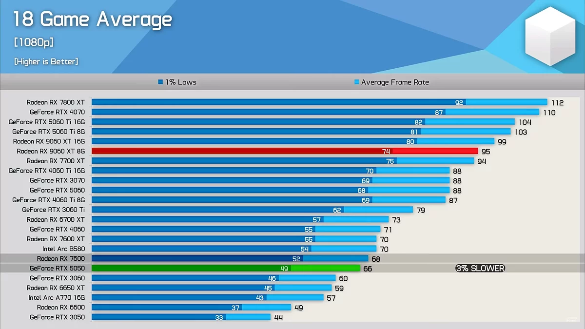 Em média, a RTX 5050 ficou atrás da Radeon RX 9060 XT (8GB) em 44% nos testes da Hardware Unboxed. O déficit de desempenho em comparação com a versão de 16GB da RX 9060 XT aumentou para impressionantes 80%. Mesmo a RTX 5060 da geração anterior da NVIDIA, com preço semelhante de $299, mantém uma vantagem de desempenho de 30% sobre a nova RTX 5050.